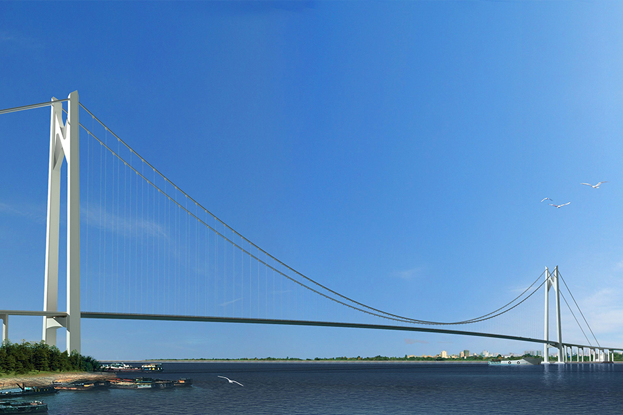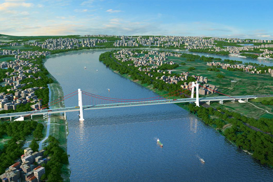 瀘州城東長江二橋?yàn)橹骺?76米雙層獨(dú)跨式平行索面懸索橋,雙層公軌兩用大橋。...