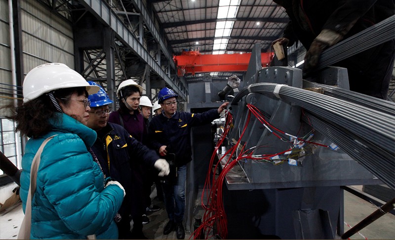 除索鞍索夾制造外,天元公司還承擔(dān)了陽寶山特大橋錨固系統(tǒng)研發(fā)及供應(yīng)、AS法的科研課題以及上部結(jié)構(gòu)施工等任務(wù)。驗(yàn)收組領(lǐng)導(dǎo)一行檢查了天元公司科研試驗(yàn)現(xiàn)場,并細(xì)致了解科研試驗(yàn)開展情況,對于科研課題的順利開展,驗(yàn)收組領(lǐng)導(dǎo)給予了高度的評價。
