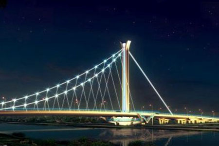 邵陽(yáng)桂花大橋采用雙塔三跨自錨式懸索結(jié)構(gòu),主跨120米,全長(zhǎng)541米,寬33.8米...